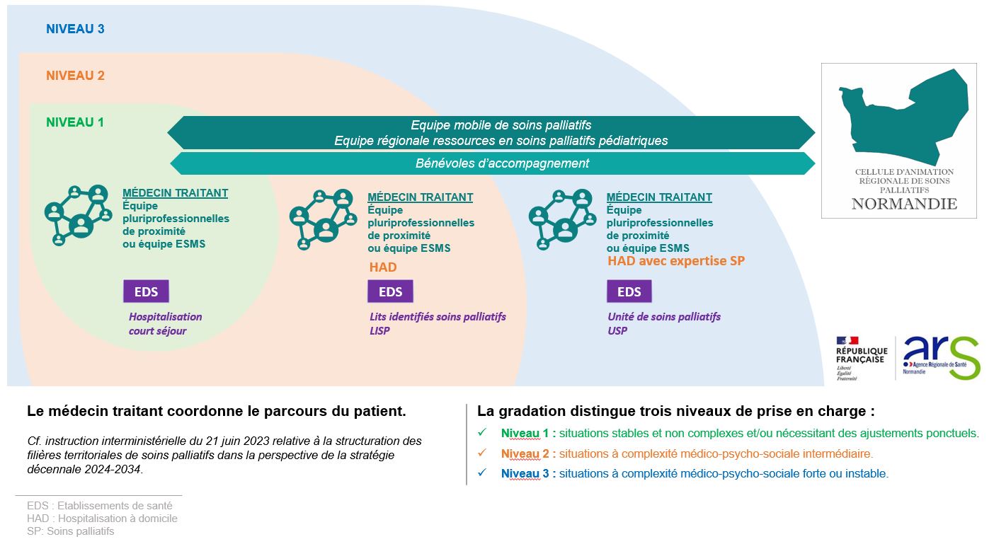 Professionels de niveau 1 + Appui des équipes expertes en soins palliatifs (EMSP-ERRSPP)* Ou HAD en lien avec les professionnels du niveau 1 +/- Appui des équipe expertes en soins palliatifs (EMSP-ERRSPP)* |