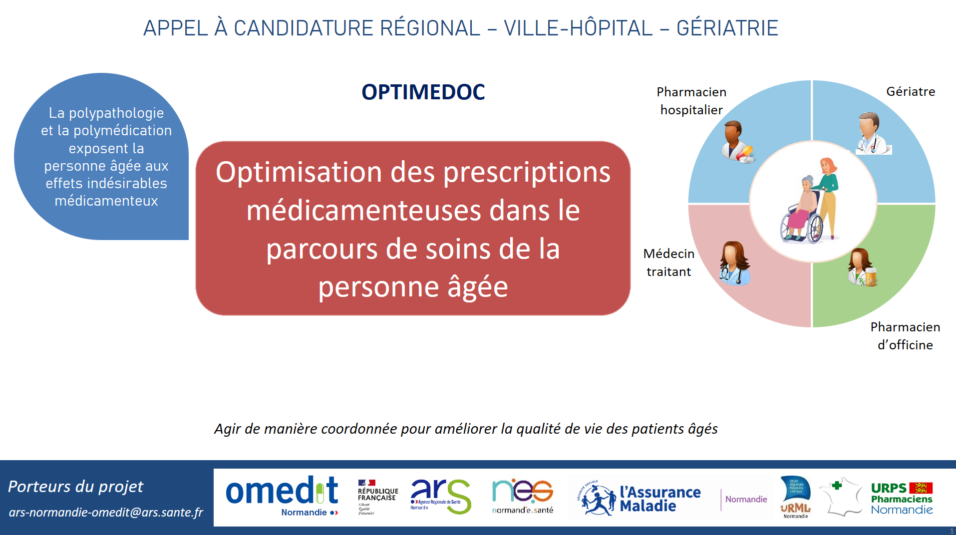 L'objectif du parcours OPTIMEDOC est d'améliorer le lien ville-hôpital au travers de l'optimisation médicamenteuse chez le patient âgé fragile polymédiqué à risque de iatrogénie médicamenteuse, et notamment de chutes.