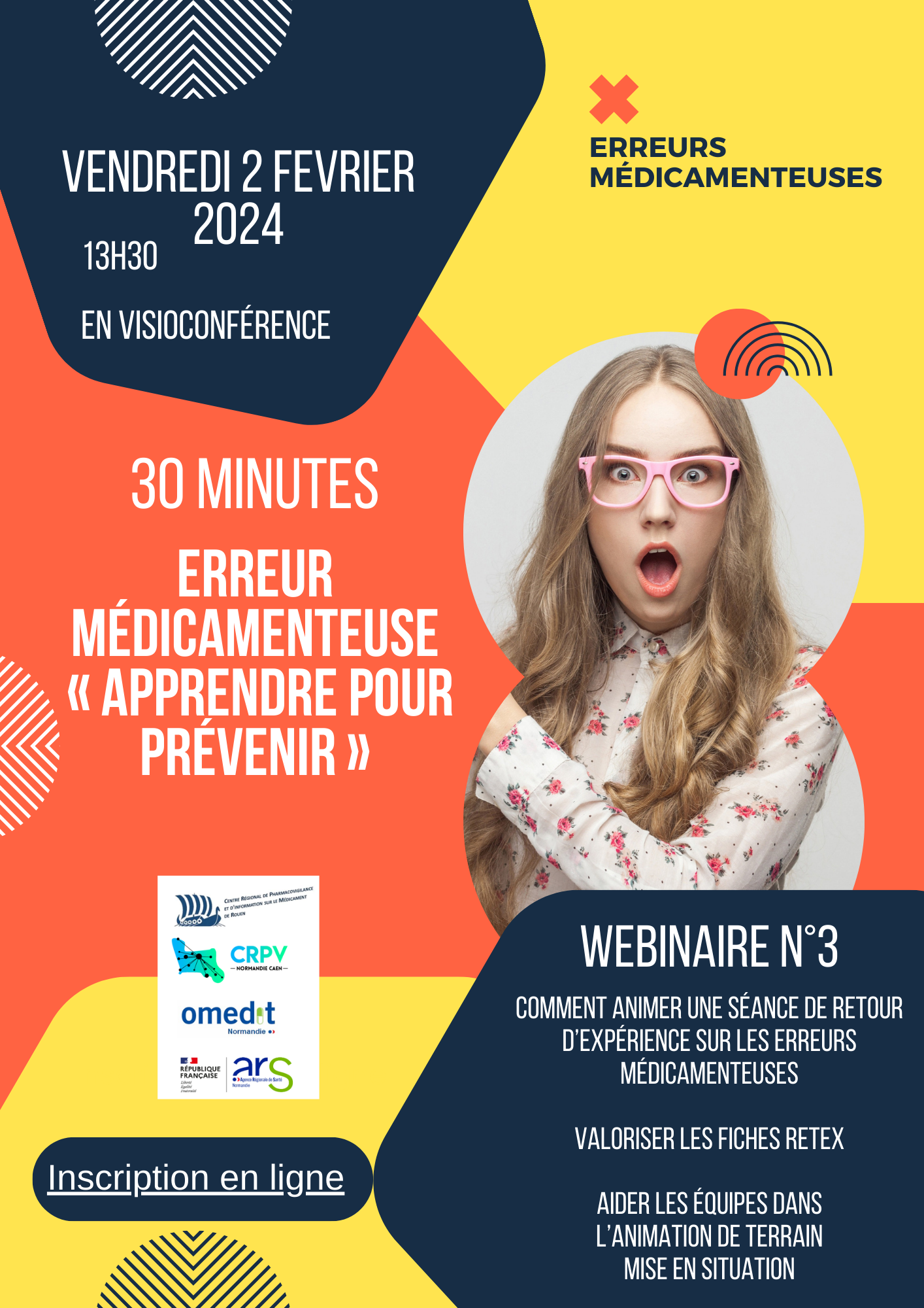 | | | Vendredi 2 février de 13h30 à 14h | |  Prochain webinaire : Mieux partager autour des erreurs médicamenteuses pour agir plus efficacement : comment animer une séance de retour d’expérience sur les erreurs médicamenteuses Vendredi 2 février de 13h30 à 14h Objectif : valoriser les fiches RETEX et aider les équipes dans l’animation de terrain, retour d’expérience Inscription en ligne : ICI | |