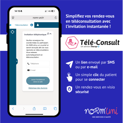 Le service de téléconsultation de Norm'Uni s’enrichit d’une nouvelle fonctionnalité clé : l’envoi d’invitations instantanées par SMS ou e-mail depuis votre smartphone/tablette, pour vos téléconsultations.
