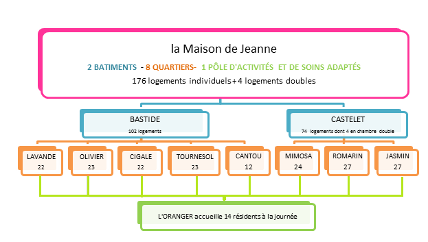 La Maison de Jeanne propose un hébergement permanent. L’établissement est organisé en quartiers de 12 à 27 personnes, rendant conviviale la vie ensemble.