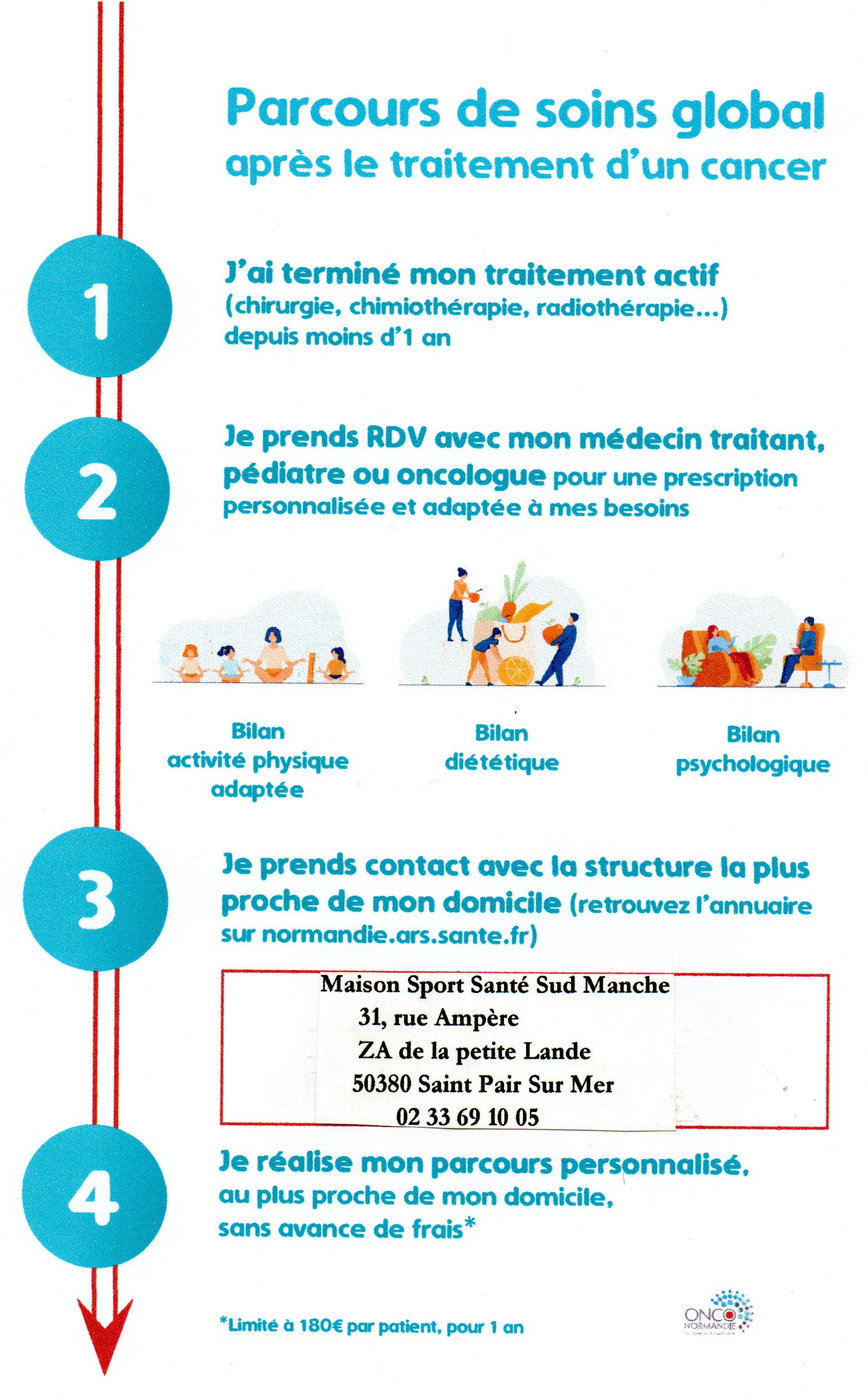 Ainsi, la Maison Sport Santé sud Manche situé à Saint Pair Sur Mer (31, rue Ampère-ZA de la Petite Lande / 02 33 69 10 05 ) est engagée dans ce dispositif et vous accompagne de façon gratuite et personnalisée en diététique, psychologie et activité physique adaptée.