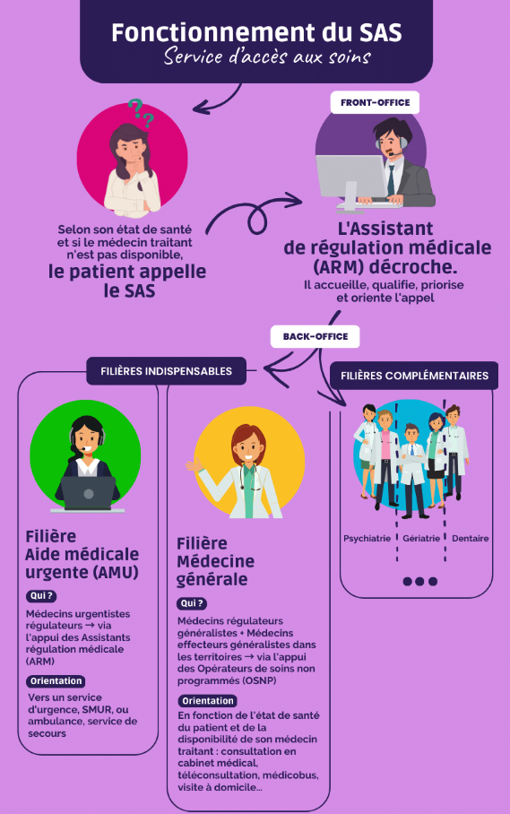 Le SAS permet d’organiser la réponse adaptée à une demande d’un patient confronté à un besoin de soin urgent ou d’un patient confronté à un besoin de soin non programmé n’ayant pas de médecin traitant ou dont le médecin traitant n’est pas disponible.