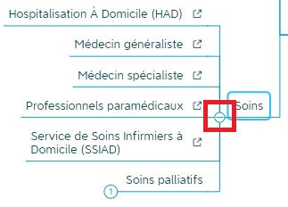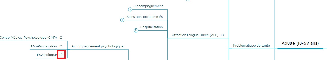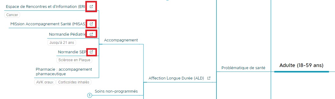 Vous commencez alors à explorer le parcours, en fonction des besoins et des problématiques de la personne accompagnée. Vous découvrirez un nouvel icône, un carré fléché, qui est un lien externe.