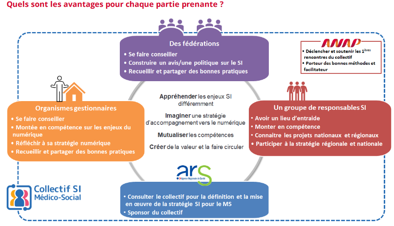 Créé en octobre 2022, le collectif SI rassemble les acteurs du secteur médico-social et social d'une région autour du sujet du numérique : ESSMS, organismes gestionnaires, fédérations, ARS, GRADes, ANAP.
