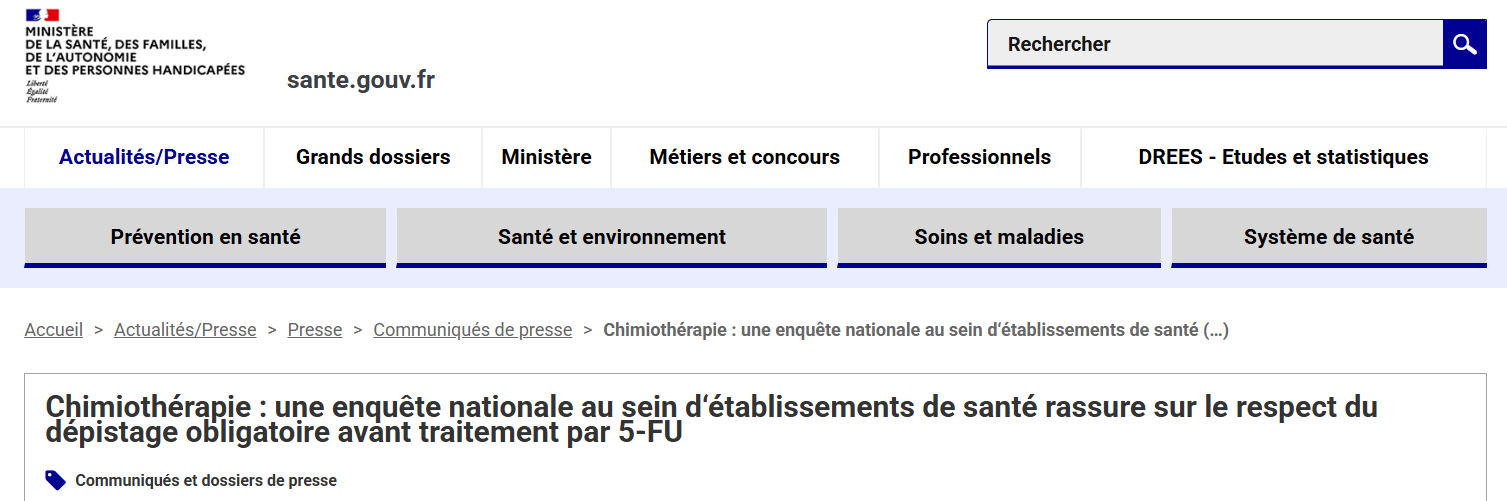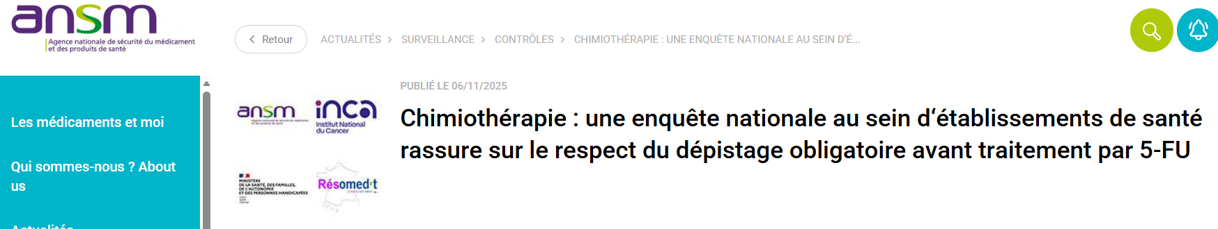 C’est pourquoi, depuis 2019, un dosage sanguin appelé uracilémie est obligatoire avant toute première prescription de 5-FU. Ce test permet de détecter un éventuel déficit en DPD qui aura pour conséquence d’adapter la posologie ou d’éviter l’administration de 5FU.