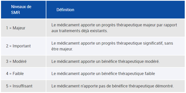 Le SMR mesure l'efficacité médicale d'un médicament. Il s'agit d'une appréciation globale du bénéfice thérapeutique d'un médicament comparé aux traitements déjà disponibles pour une même indication. 5 niveaux de SMR sont définis :