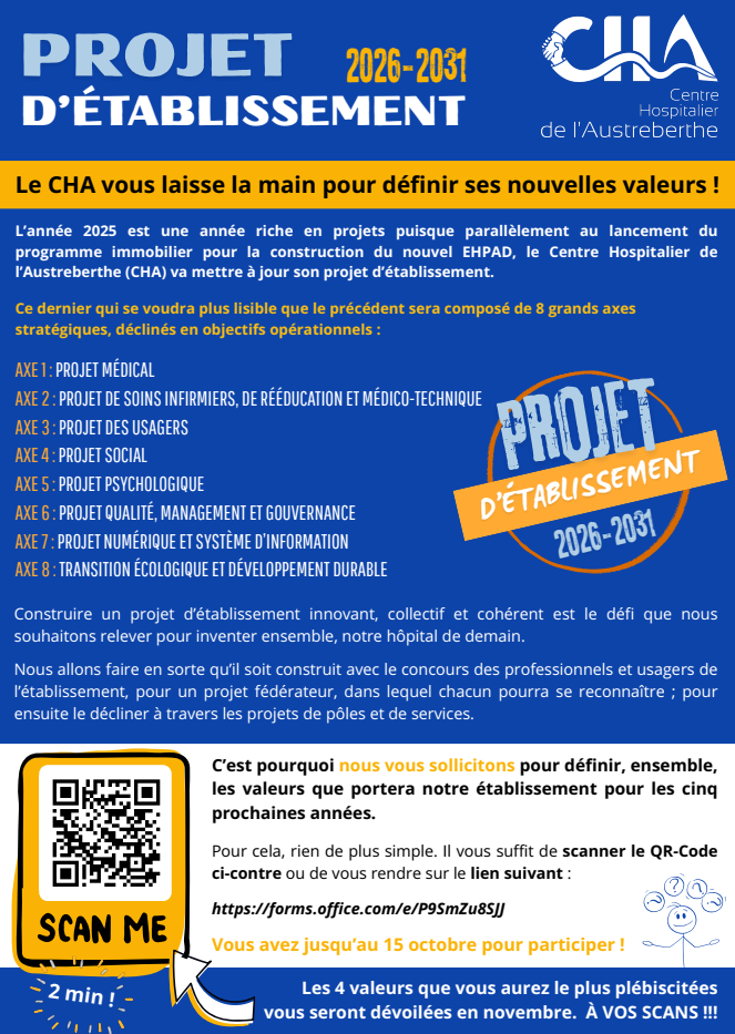 Dans le cadre de la mise à jour de son projet d'établissement, le Centre Hospitalier de l'Austreberthe vous sollicite pour définir ses nouvelles valeurs pour les 5 prochaines années.